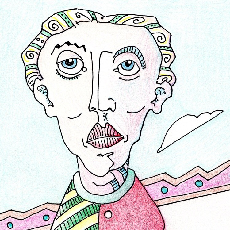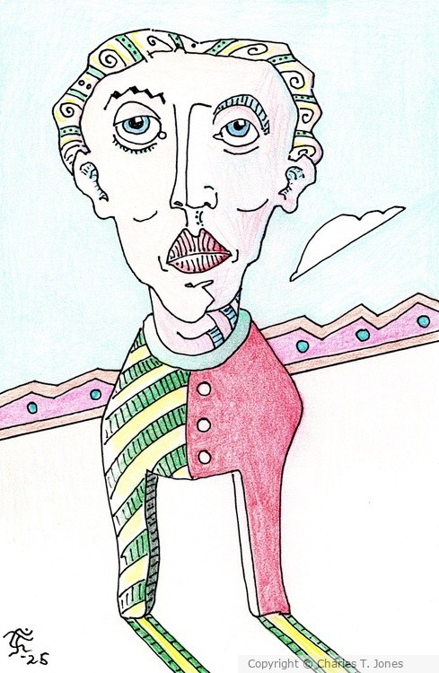 Yeah, you might say that about a lot of my figures. This is a 9 by 6 inches gel pen with color pencil drawing on medium weight acid-free paper. My neighbor took me to the last-stop Goodwill again and I found another like-new sketchbook of acid-free paper. It's similar to my usual paper but has a bit more tooth, so it took the color a bit differently. So Original Jones Art is still putting-out in northwest Austin, Texas. Well, my output is increasing incrementally at least.