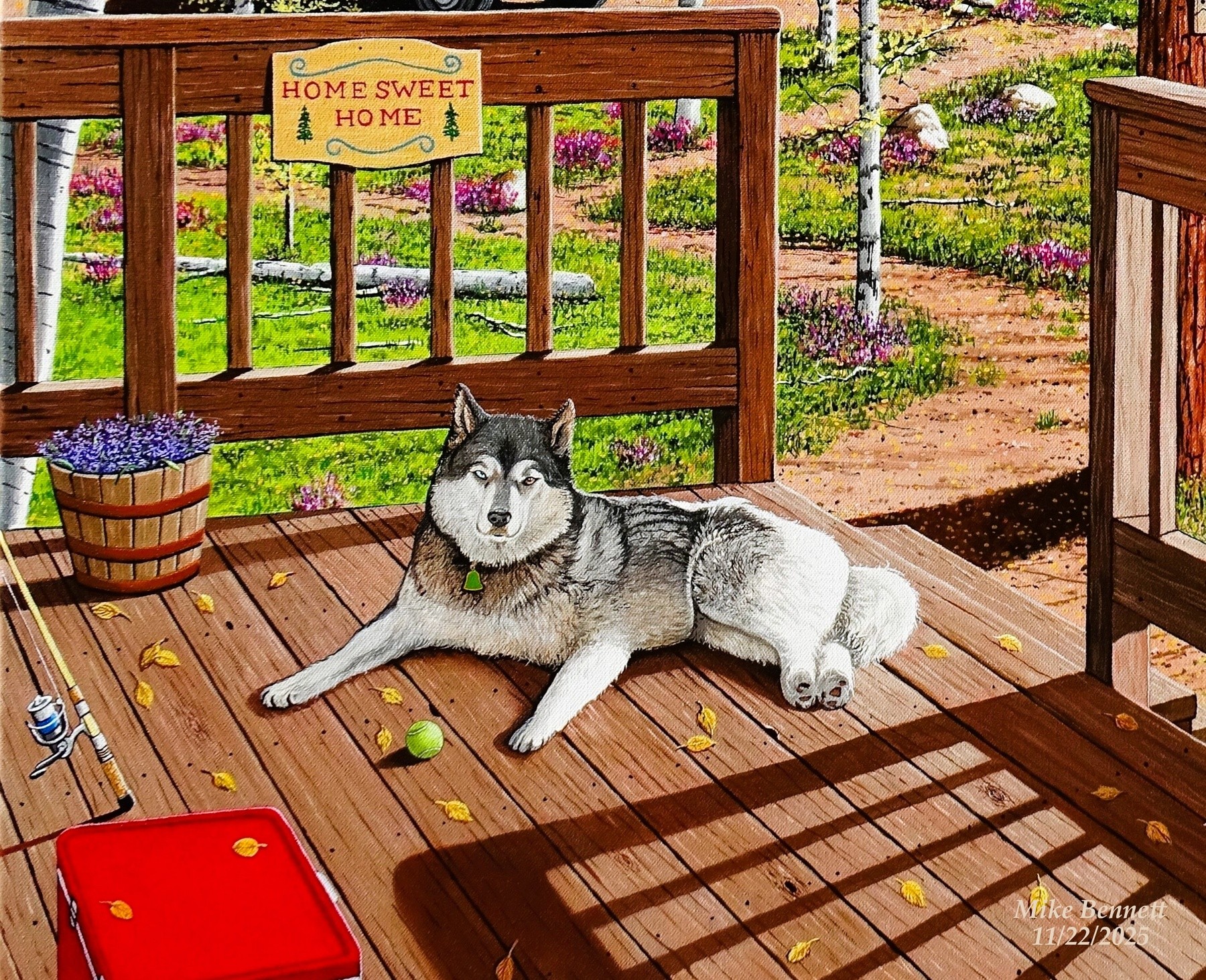 This is a view of a husky named Nathan, flowers, a fishing pole, an ice chest as viewed from a cabin deck. This also a cropped part of a painting from this site called, "Waiting for his Master".