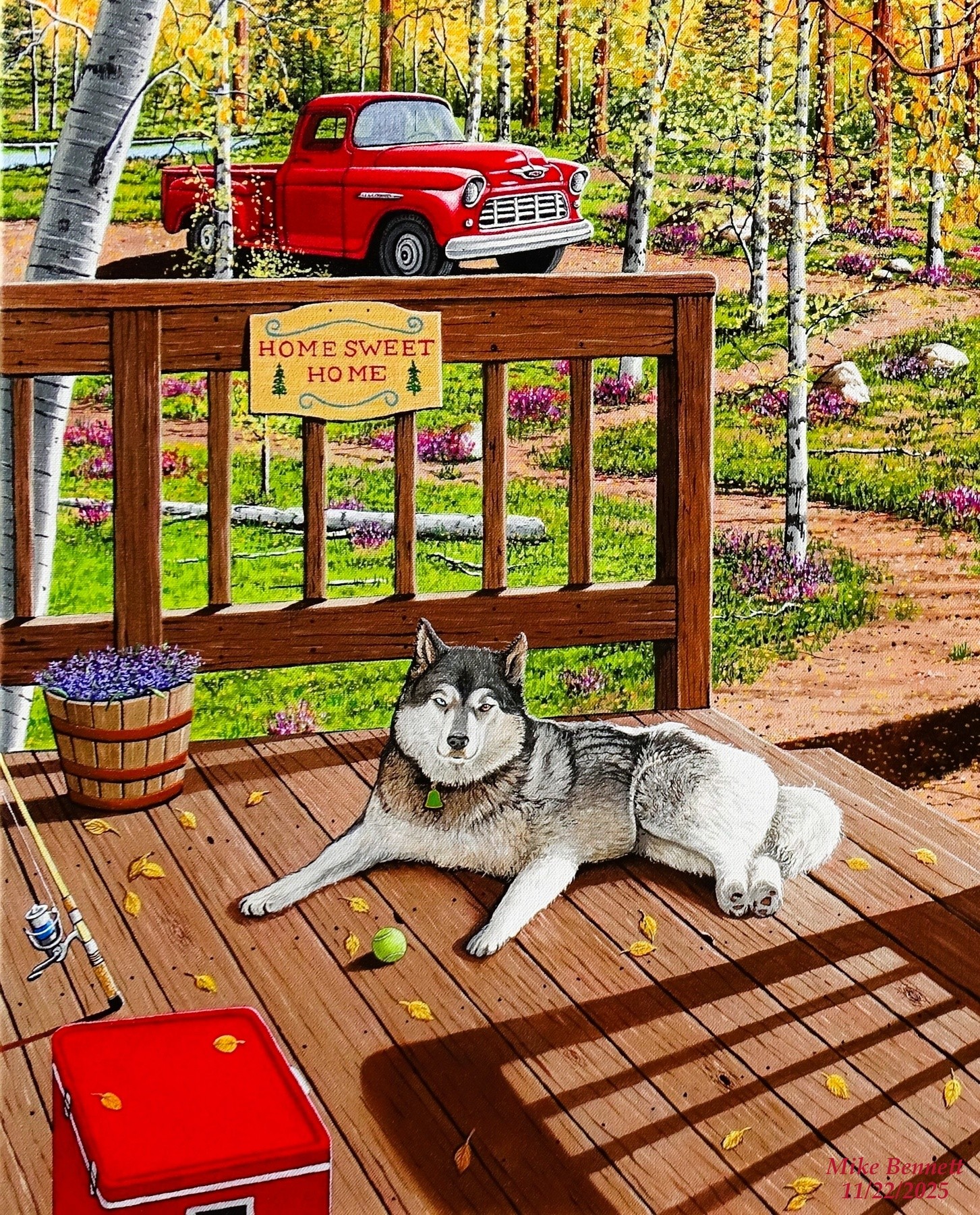This is a view of a husky named Nathan, a 1955 Chevy Truck, flowers, birch trees, and nature near a lake as viewed from a cabin deck. This also a cropped part of a painting from this site called, "Waiting for his Master".