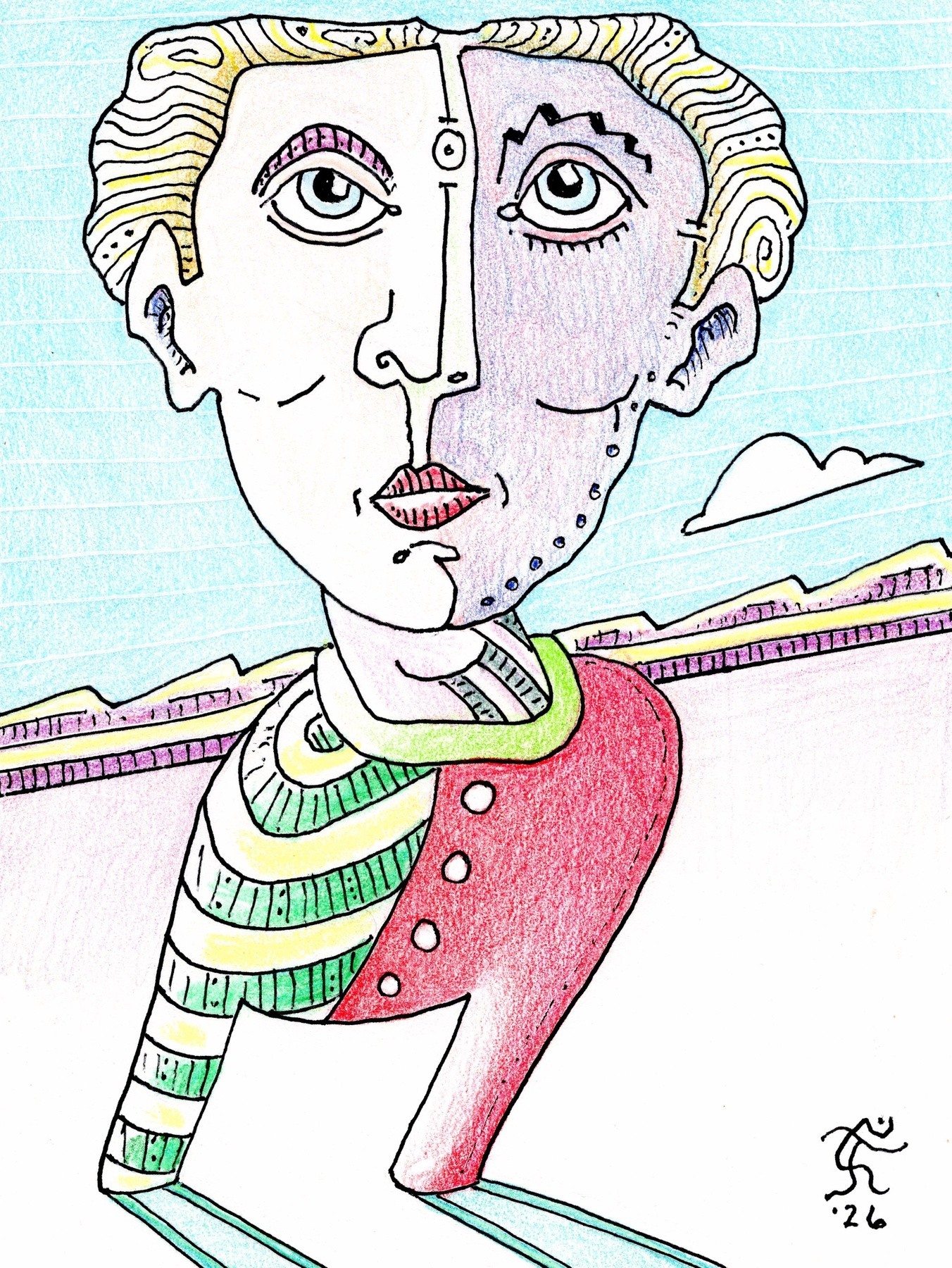 Whether one bends with the wind or battles against it, tells a lot about them, I think. Of course, I also think the velocity of said wind should be taken into account. This is a 6 by 4.5 inches gel with with color pencil drawing on medium bond acid-free paper. Original Jones testing the wind in northwest Austin, Texas.