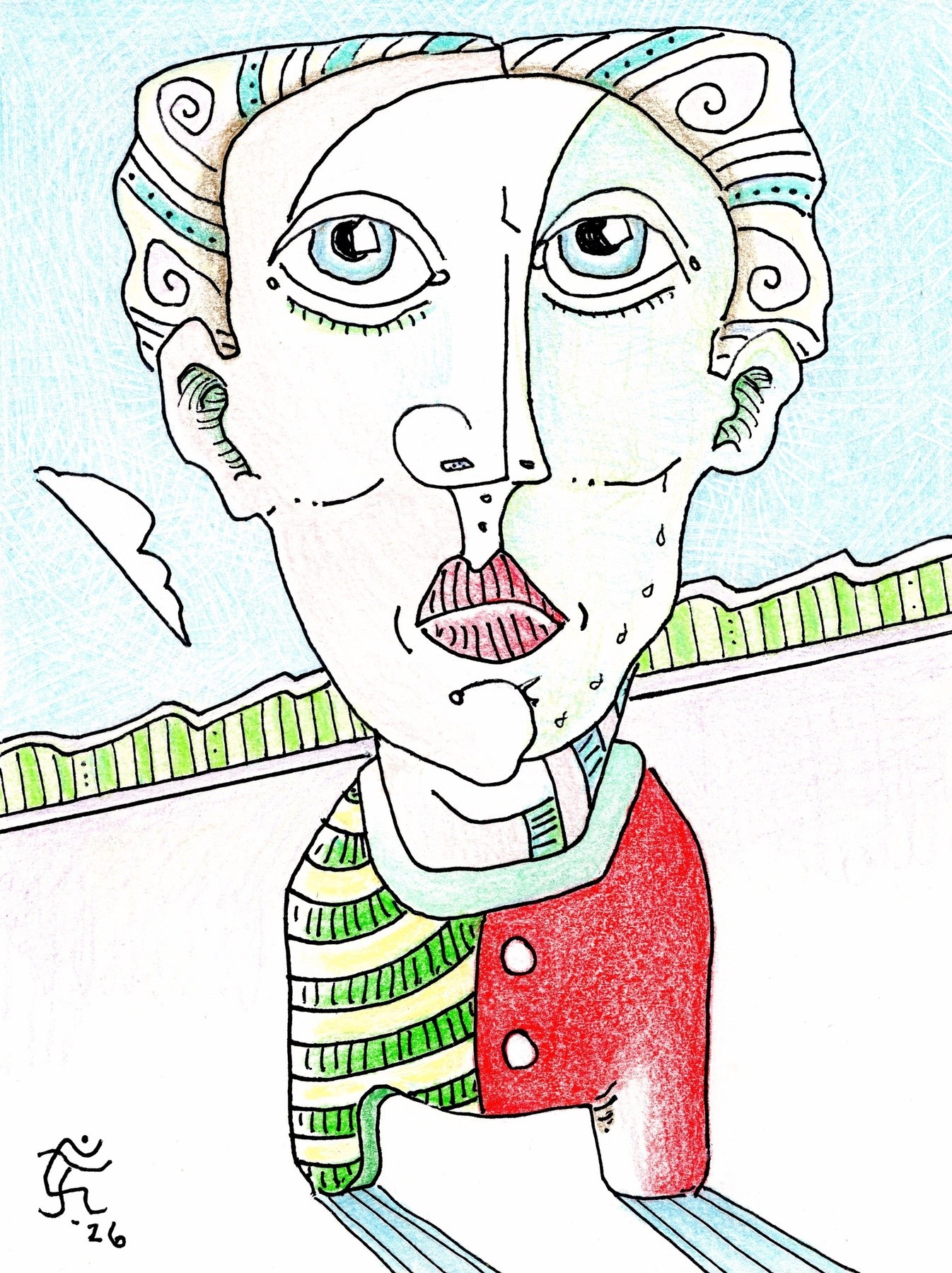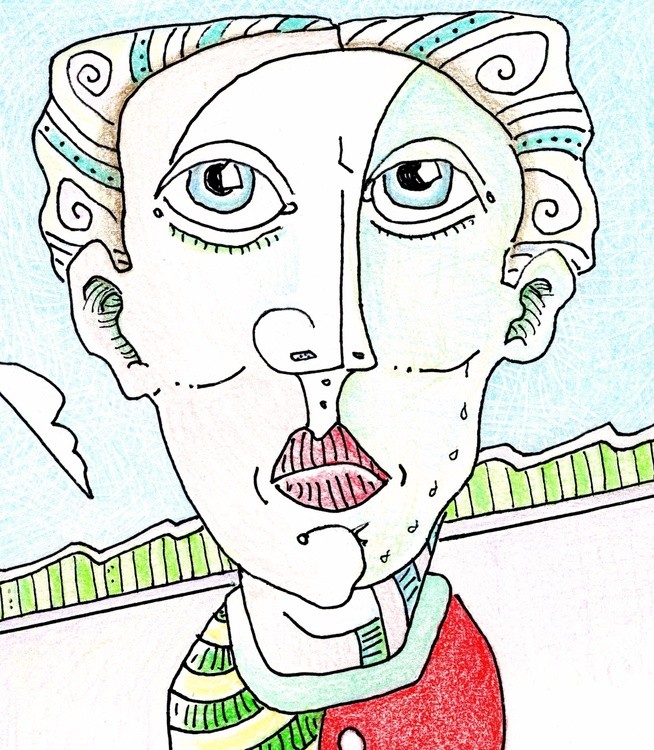He walked into a Beauty Salon by mistake and got a perm and a dye job. He still doesn't know if he likes it yet. He's not bummed so much as numbed. This is a 6 by 4.5 inches gel pen with color pencil drawing on medium bond acid-free paper. Original jones Art still doing his own hair, what's left of it, in northwest Austin, Texas.