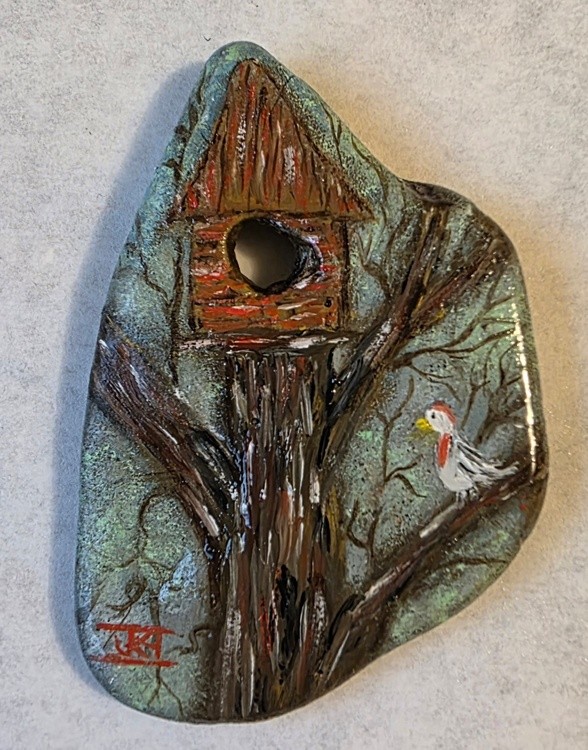 Decided to paint a bird house with this stone with a hole in it. Oil.