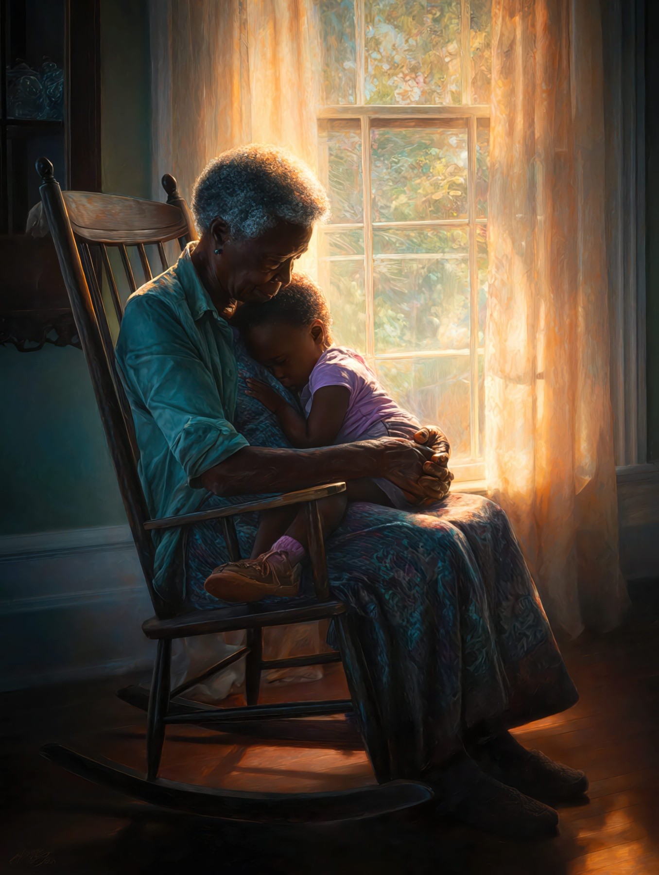 In the soft glow of window light, a grandmother holds her grandchild close, creating a peaceful moment suspended in time. The scene radiates warmth and tenderness, capturing a loving bond that feels both deeply personal and timeless.