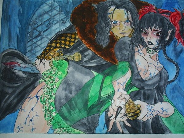 A watercolour painting of my original character Tathiel and her lover Grima Wormtongue from lord of the rings. I used a referenced for the pose from Magna Carta.