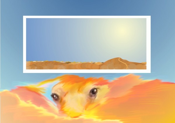 A camel dreaming of the old days before war, du, pollution, cities and consumerism. Corel Photopaint. Copyright Bruce Hill 2006
