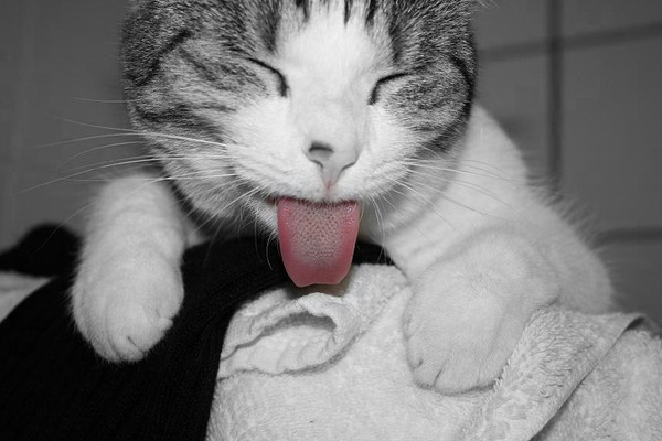 what a great shot, what she doing giving you the rasss? hehehe! I love the tones of blknwht and the pink tongue. Excellent shot!