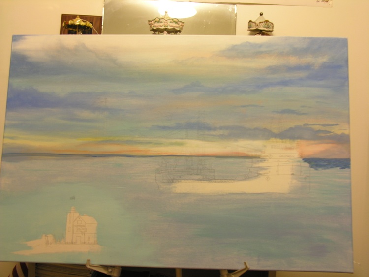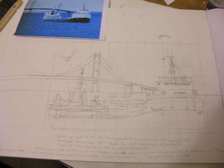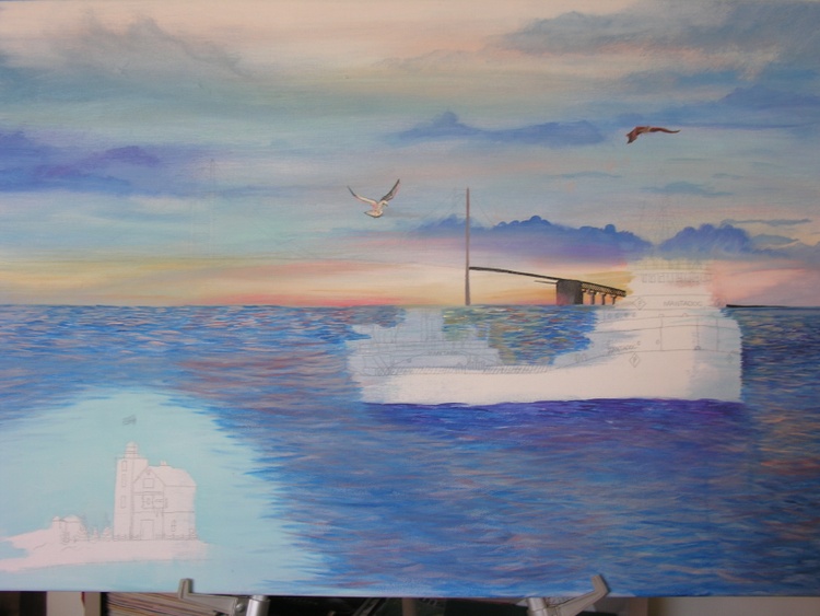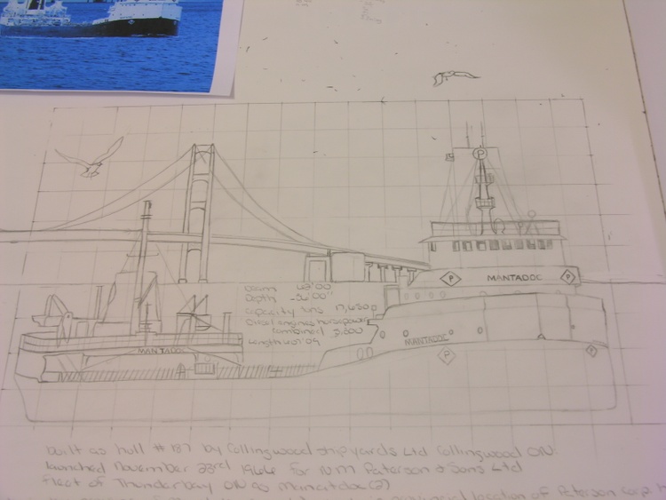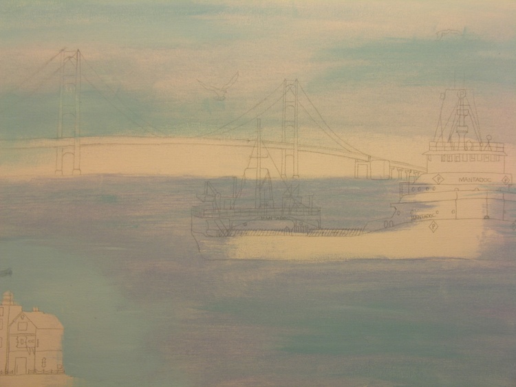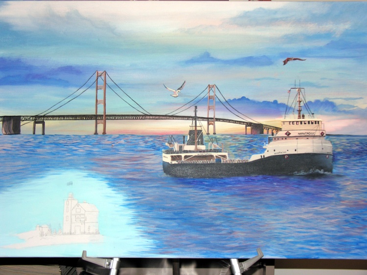 This is a painting of the Makinaw bridge, with the Mantadoc ship passing by and a small portrait of the Makinaw Lighthouse at the bottom left.