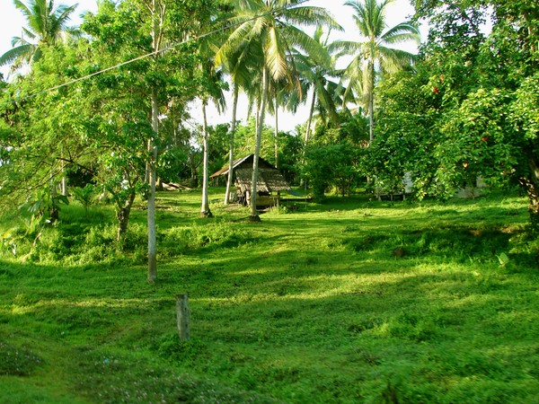 the province, so tranquil... a bamboo house with coconut leaves roof on the scene.. with few coconut trees around the area.. fresh air.. can only hear birds singing... so cool! my kind of place