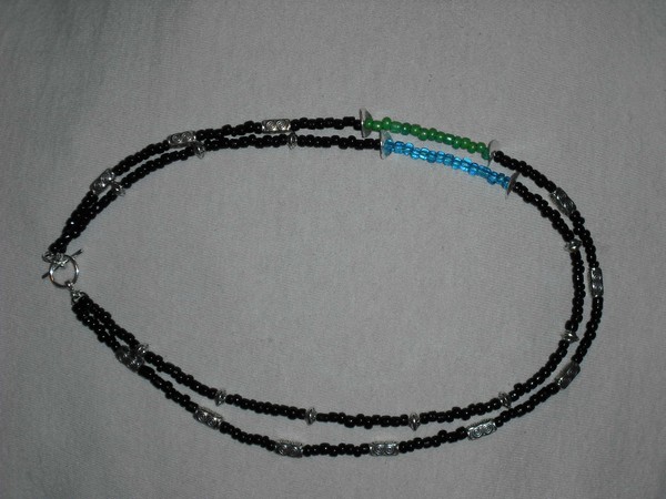 Double strands black beads with silver accents , altenate bands of blue and green.