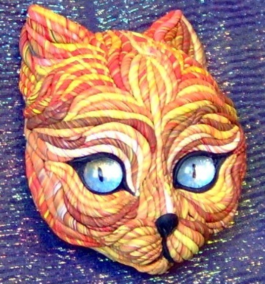 An original sculpture by me, Jane Priser. This is an orange cat face sculpture wall hanging. She has twisty strands of orange fur with many subtle colors. This kitty face also has luminous sparkly blue eyes. Her eyes are clear glass cabochons that I have backed with sparkly blue to shine through for depth and expression. This sculpture is completely original and handmade by me. A polymer clay creation. A wire is on the back for easy hanging. 4" tall.