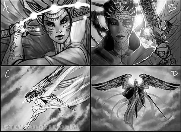 In the sketch phase, me and Jeremy (Magic AD,) were experimenting with the idea of a "covenant" motif for this. If you check out the sketches, you'll see that she almost got a face-tattoo of Magic's version of the Ten Commandments. (Which I imagine are way more fun than the real Ten.)