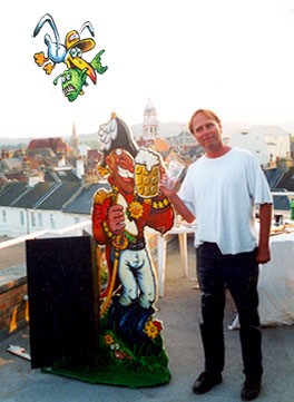 Nick Lyons has been a freelance cartoonist for over 20 years, commissions, prints and editorial cartoons. Brought up in Alderley Edge Cheshire, England. He started seriously at aged 11 and at 14 drew a cartoon poster of his Alderley Edge tennist club and sold prints there. From then on the rest is history. At 18 he worked as a resident cartoonist for the Publishers D.C. Thompsons in Scotland, drawing zany cartoons for The Beano and The Dandy and many of their other 40 comics, magazines and newspapers. Two years later Nick moved to Bordeaux in France working as a freelance cartoonist doing gags for Bordeaux newspaper Sud Ouest, local magazines, advertising agencies, wine and surf cartoons, jokes and exhibitions. It was here when Nick first started hiding a frog and snail in his cartoons. Finding work for a national magazine Lui in Paris, Nick decided to settle in Val d`Isere in the French Alps. Still sending work to Paris, London and Bordeaux. He drew many ski cartoons, created Joe Powder, ski posters, ski prints and sent work back to London. The summers he resided back on the Atlantic coast doing surf prints, wine prints, t-shirts, newspaper gags and coming up with next winters postcards and sweatshirt designs. After 15 years of this nomadic life Nick returned to London and thesouth coast of England, still running to and fro back to France.